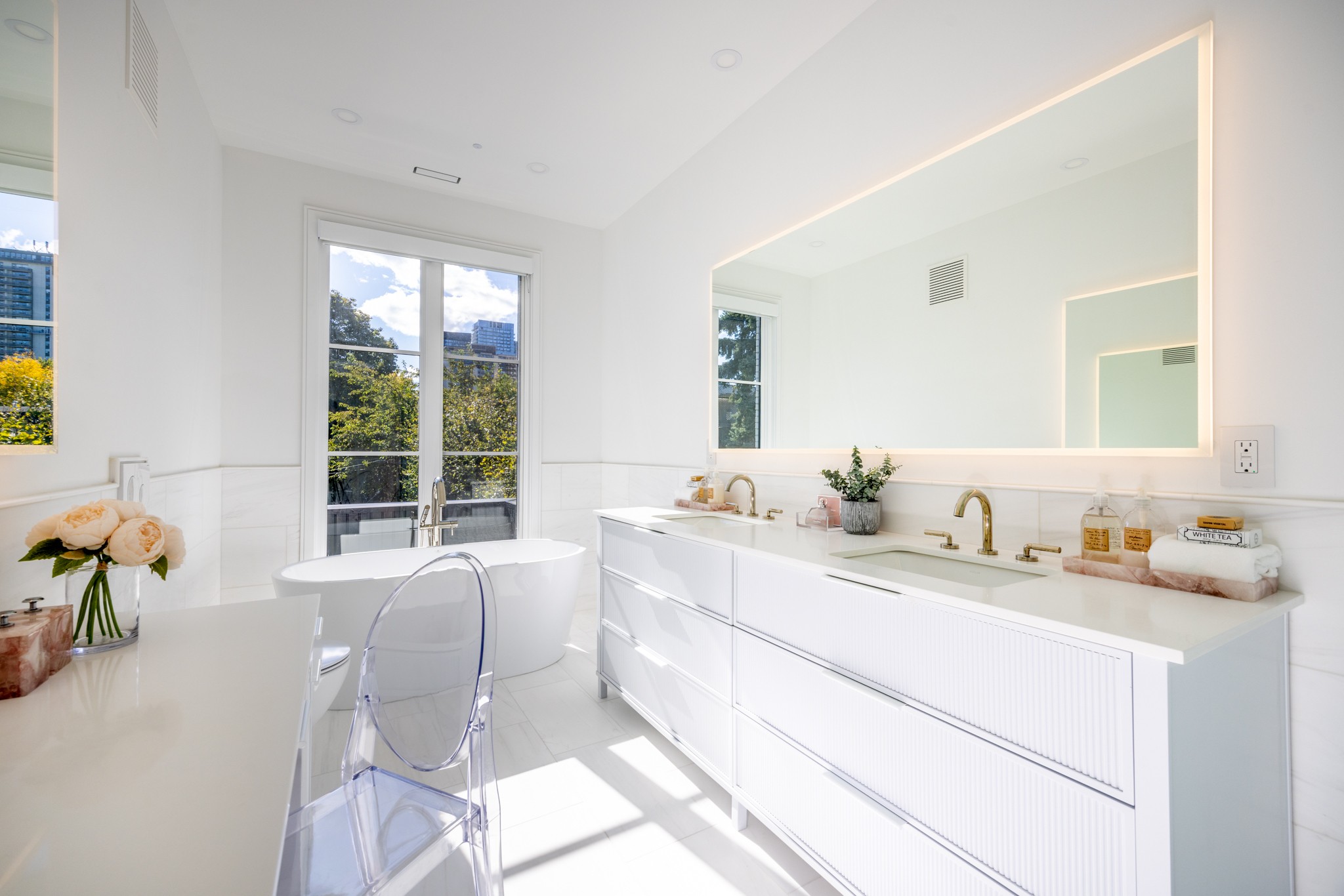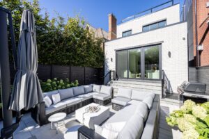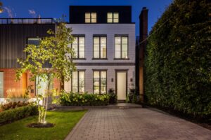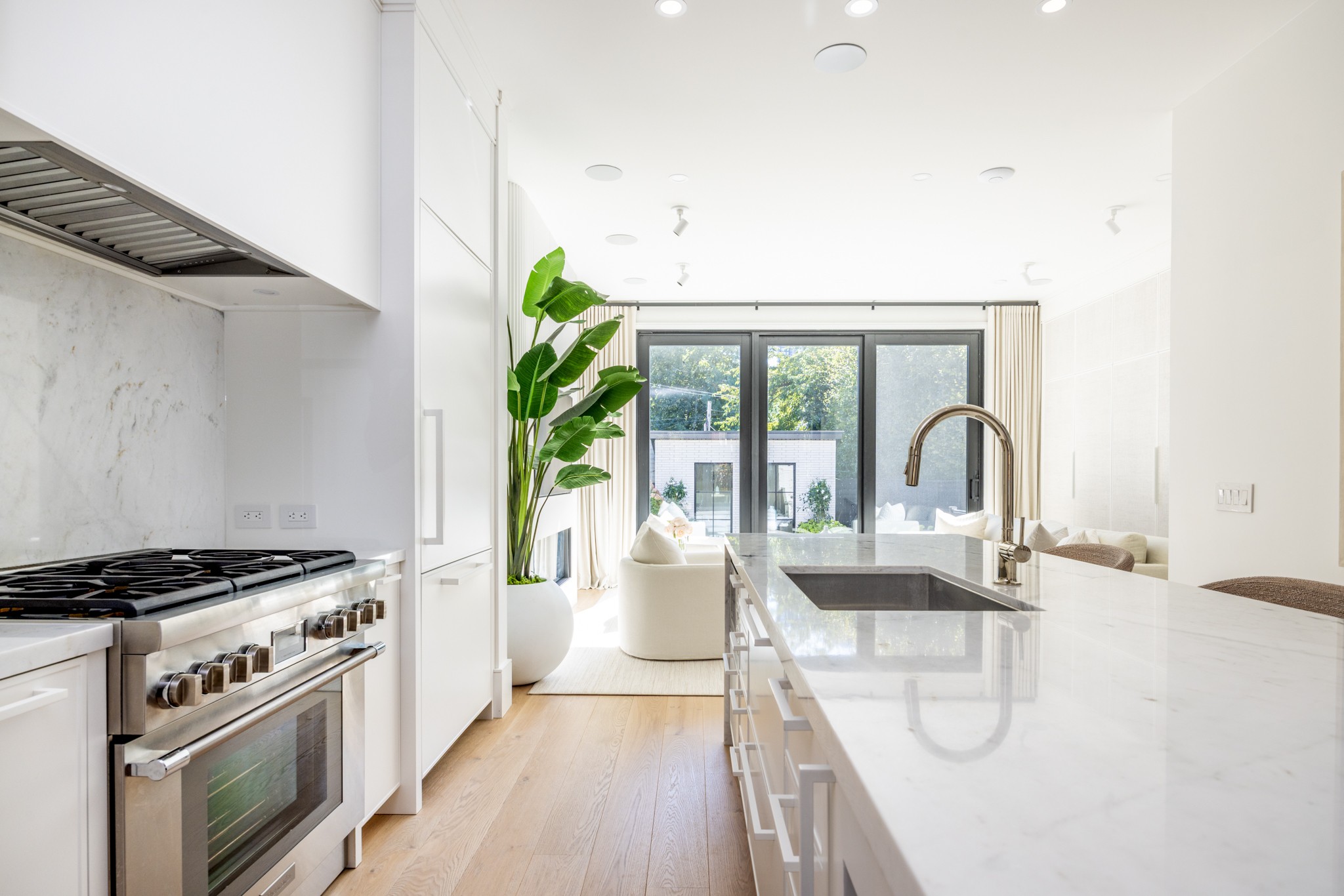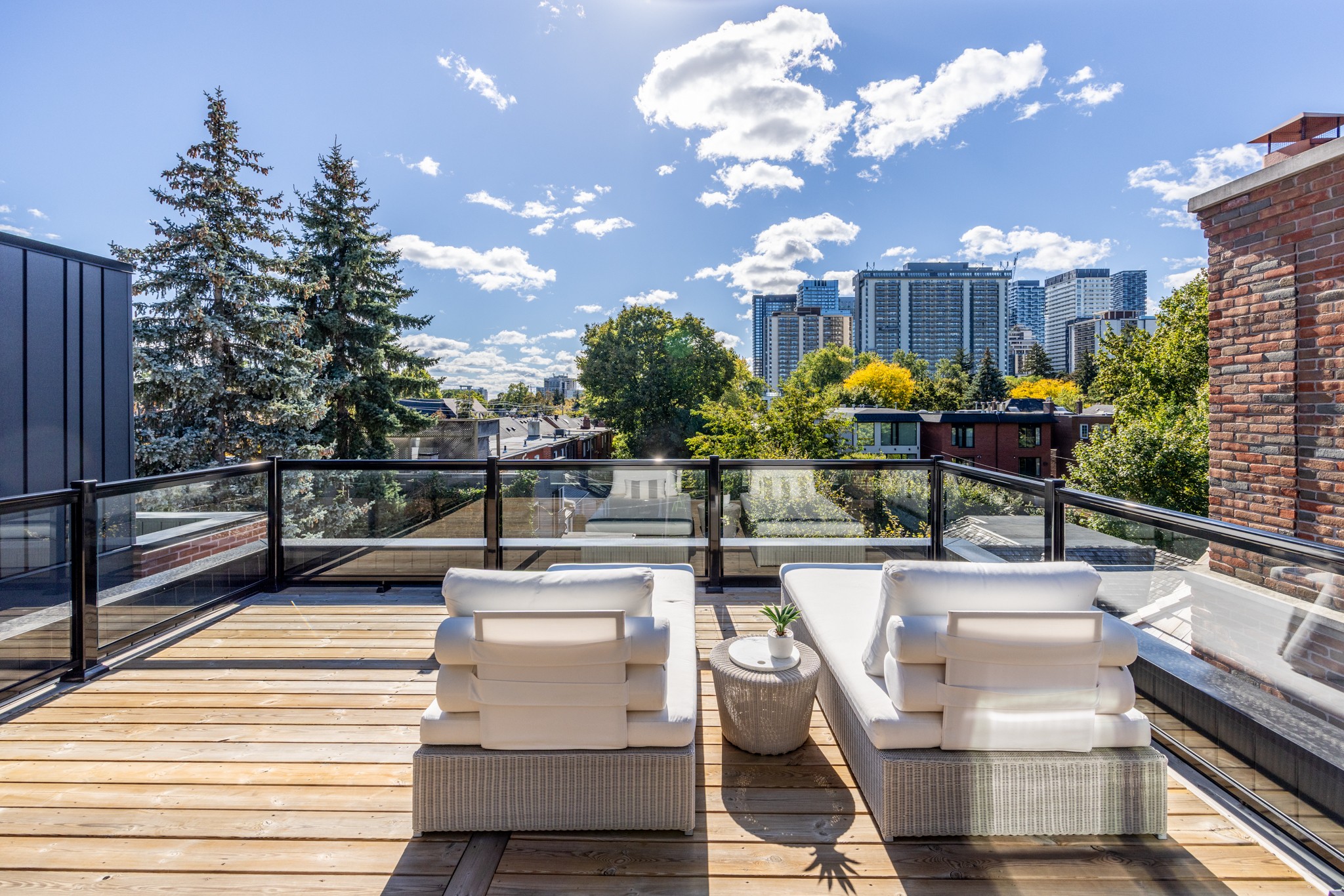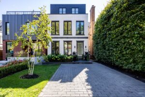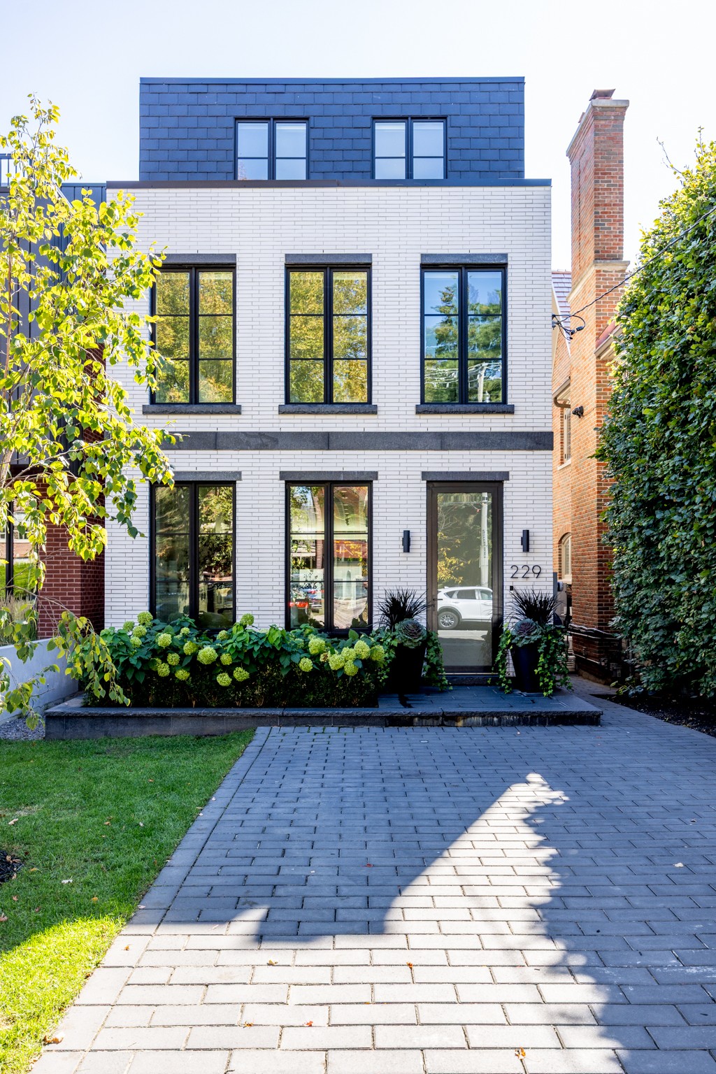 This contemporary custom-built detached residence showcases exceptional craftsmanship and meticulous space planning. Featuring a coveted southern exposure, it blends symmetry with serene, modern comfort across four finished levels, offering 4+1 bedrooms & 5 baths (3,637 sf total; 2,520 sf above grade). The private driveway, porch & side path include snow-melt for effortless year-round convenience. The main floor features 10′ ceilings, light European oak wide-plank flooring, solid-core doors & layered architectural lighting. A formal living room with fluted wood paneled gas fireplace opens to a spacious dining area with integrated storage ideal for family living and entertaining. The kitchen showcases custom millwork, quartzite slab counters and backsplash, integrated paneled appliances, dual pantries and a quartzite waterfall island with seating for four. A sun-filled family room connects seamlessly to the landscaped urban garden through 9′ sliding glass doors. The outdoor space includes a patio with lush plantings and a brick garden structure mirroring the home’s architecture. A striking powder room and side-entry mudroom complete this level. Upstairs, the primary suite offers city and treetop views, a marble-clad ensuite with freestanding tub, double vanity, make-up table, heated floors & walk-in closet. A second bedroom with ensuite and a full laundry room complete the floor. The third level features two bedrooms, a shared bath and walk-out to a 266sf private terrace with expansive views. The lower level has radiant-heated floors throughout, a recreation/media room with custom wet bar, guest/nanny/exercise room with 3-pc bath, rough-in for second laundry or mudroom and ample storage. Additional highlights: high-efficiency mechanicals, in-ground irrigation, landscape lighting, integrated audio and extensive custom millwork. Set on the sunny south side of Sheldrake in Sherwood Park steps to Summerhill Market, Mt. Pleasant & Yonge, parks, restaurants and top schools- zoned for Blythwood/ North Toronto and near Torontos leading private schools.