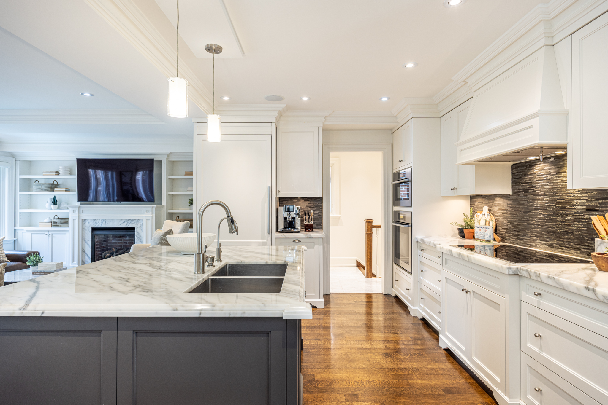At the heart of the home is a gourmet kitchen complete with a large island, marble countertops, pantry space, built-in desk and an eat-in dining area. The spacious family room, with fireplace and custom built-ins, seamlessly walks out to a deck, patio, and fully fenced private yard. A convenient 2-piece powder room, mudroom, side entrance, and direct access to the attached garage complete the main floor.